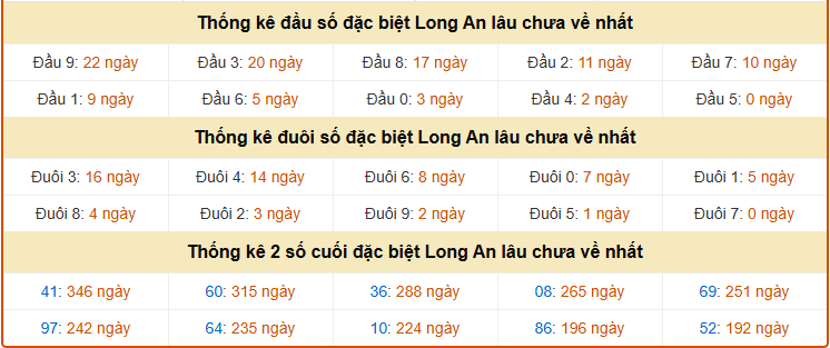 Dựa trên bảng thống kê giải đặc biệt xổ số Long An, có thể thấy nhiều đầu – đuôi và cặp số đang rơi vào trạng thái gan dài ngày. Đây là dữ liệu quan trọng để nhận diện các con số có khả năng xuất hiện trong kỳ quay tiếp theo.
